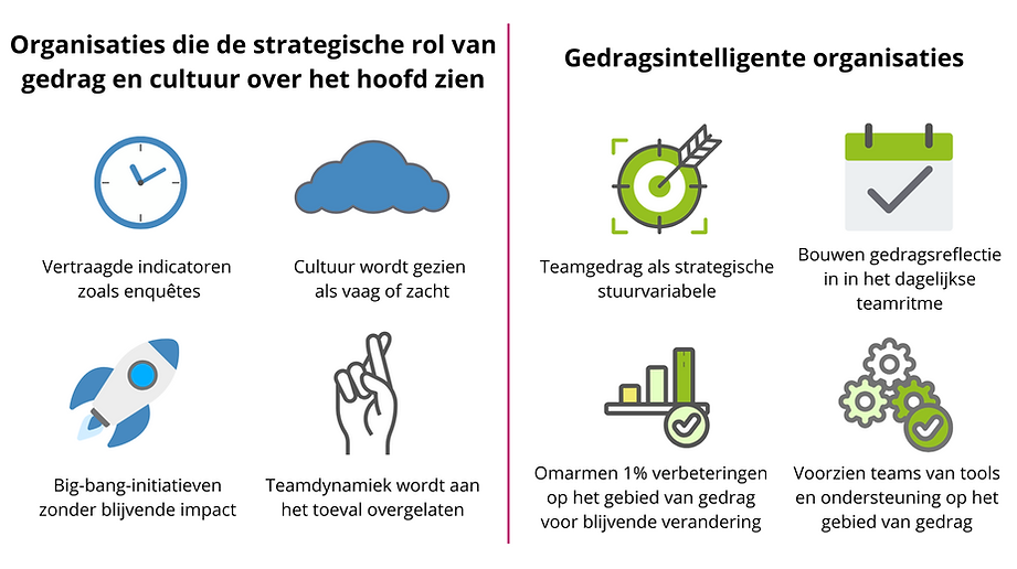 De meeste organisaties zien de strategische rol van gedrag en cultuur over het hoofd. Ze beschouwen het als iets 'zachts', 'vaags' of iets dat is uitbesteed aan HR. Waar incidenteel of tijdelijk aan gewerkt wordt op basis van enquêtes of veranderprogramma's, die zelden blijven hangen. En die ook nog eens losgekoppeld zijn van de werkelijke bedrijfsresultaten.